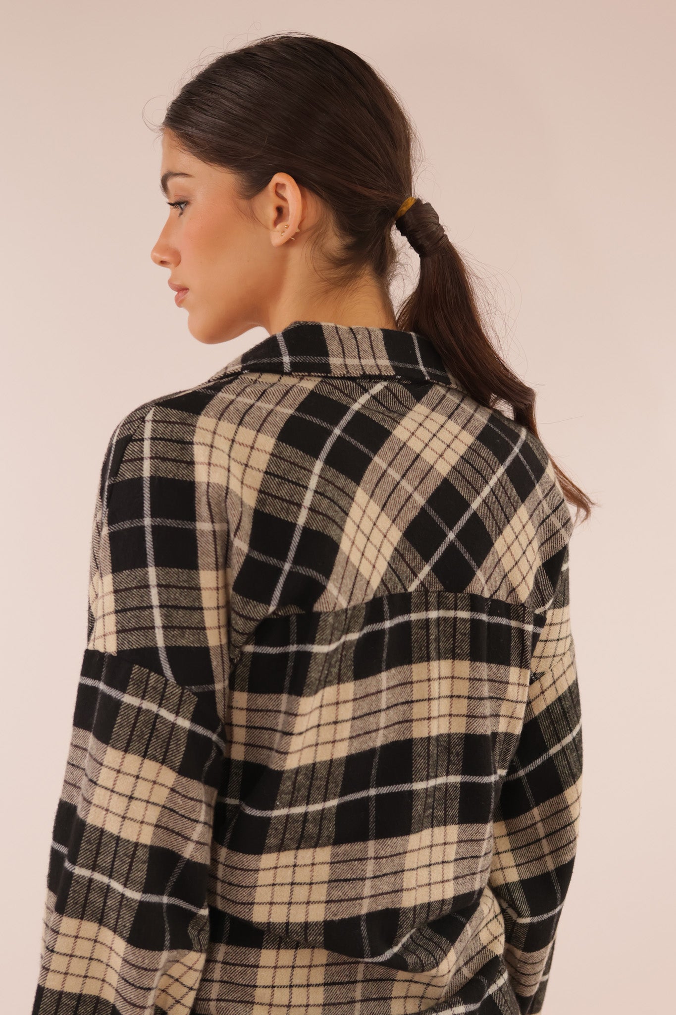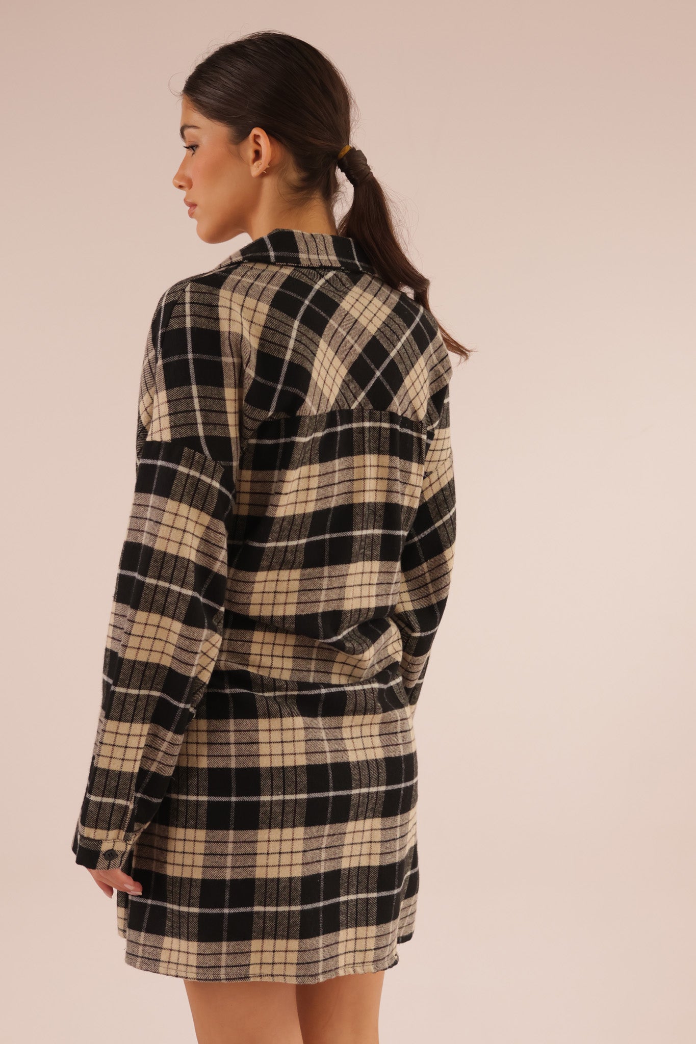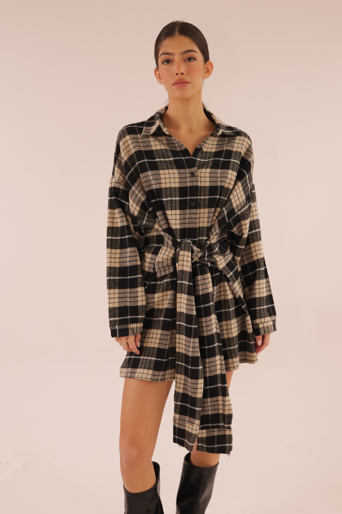 CHECK FRONT TIE TUNIC–Modern checked tunic featuring a stylish front tie.
