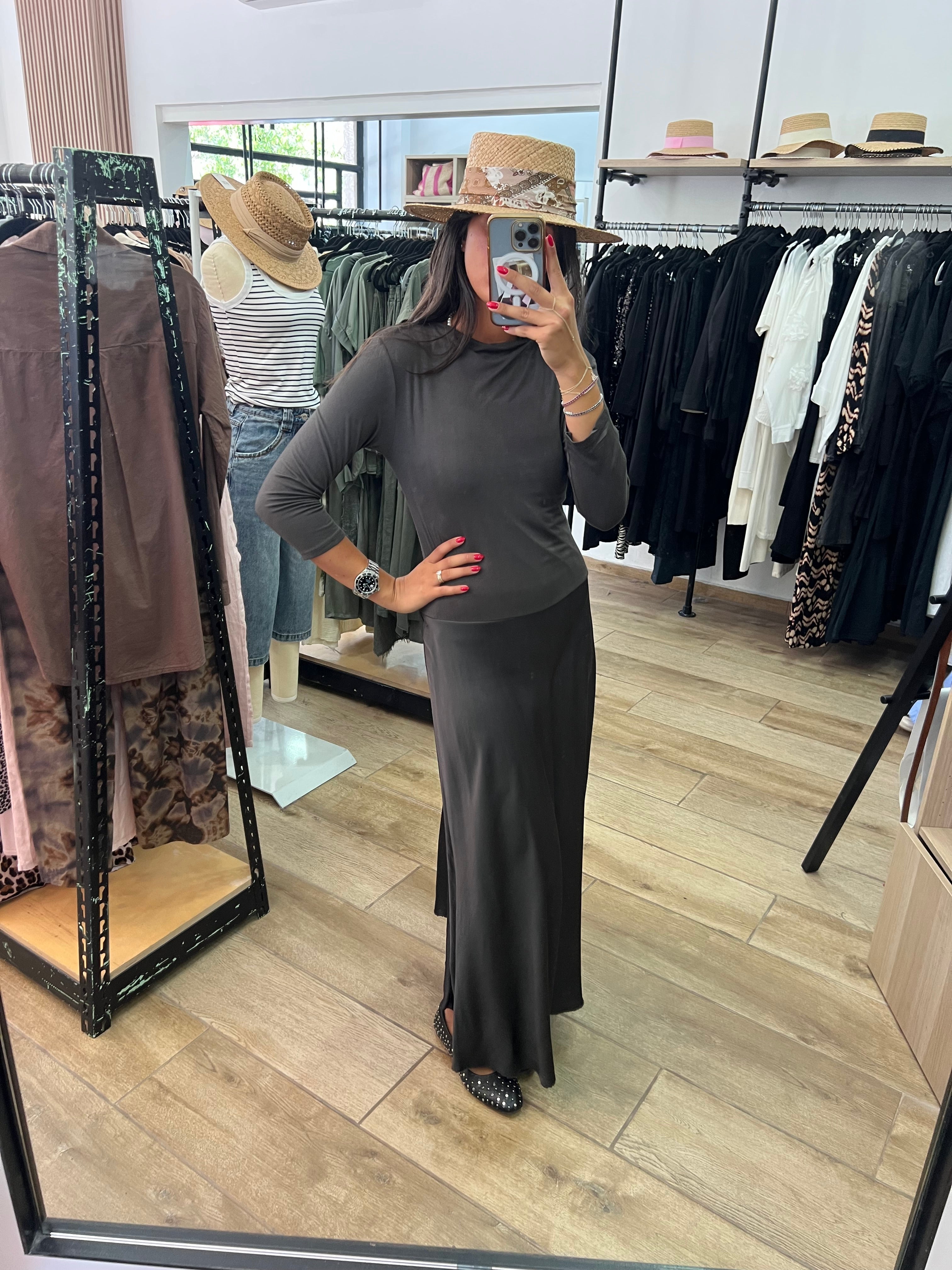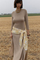 Soft stretch cotton top in a natural beige hue. Versatile and effortless, styled here with a lightweight summer scarf tied as a belt.