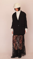 This chic blazer stands out with its elegant back detail, bringing a subtle yet distinctive twist to a timeless silhouette.