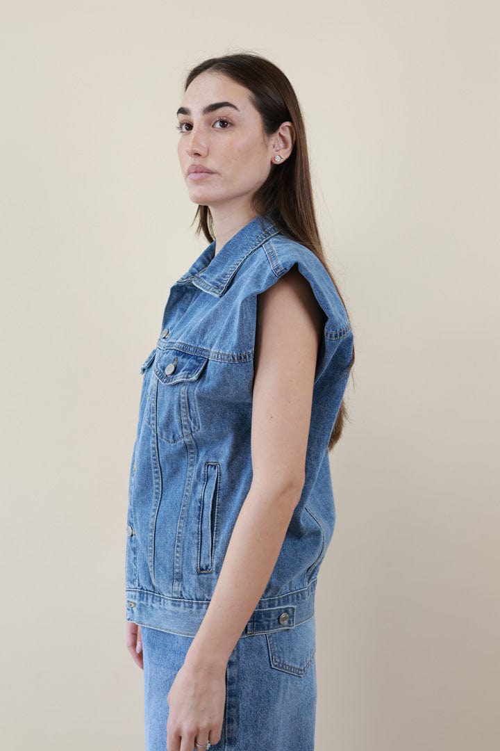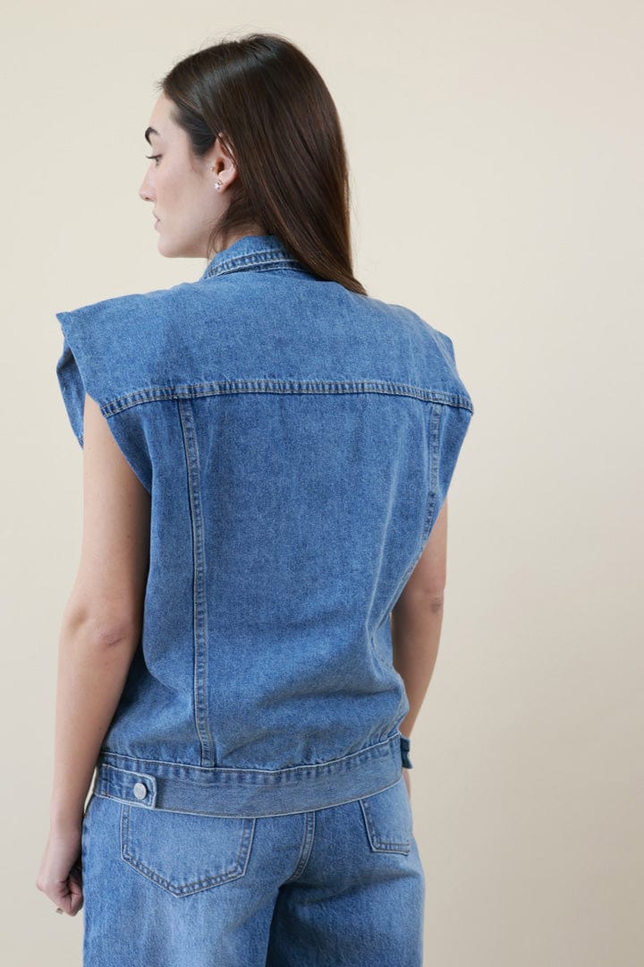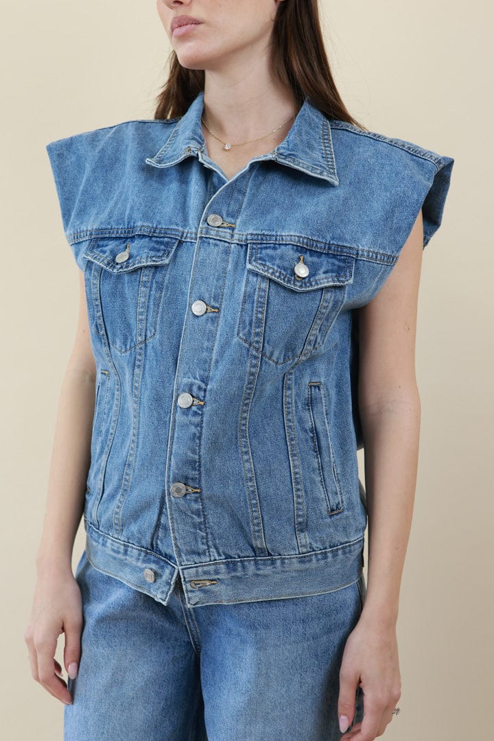 Sleeveless denim jacket with a straight cut and structured shoulders for a bold, trendy look. Perfect for layering, it adds a statement touch to any outfit.