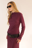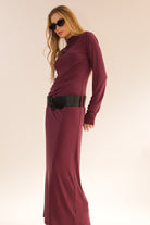 MAXI DRESS HIGH COLLAR –Long maxi dress with a high collar and minimalist design.