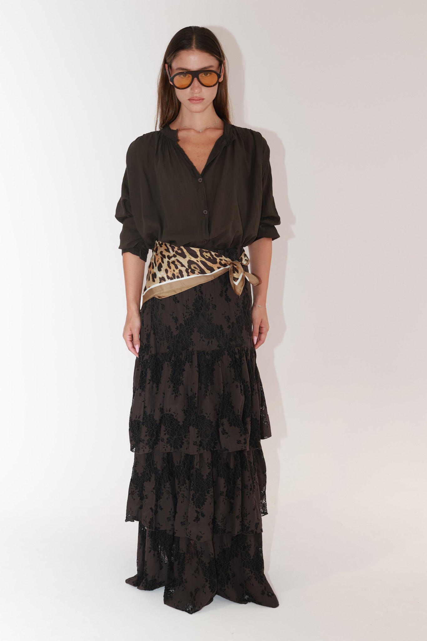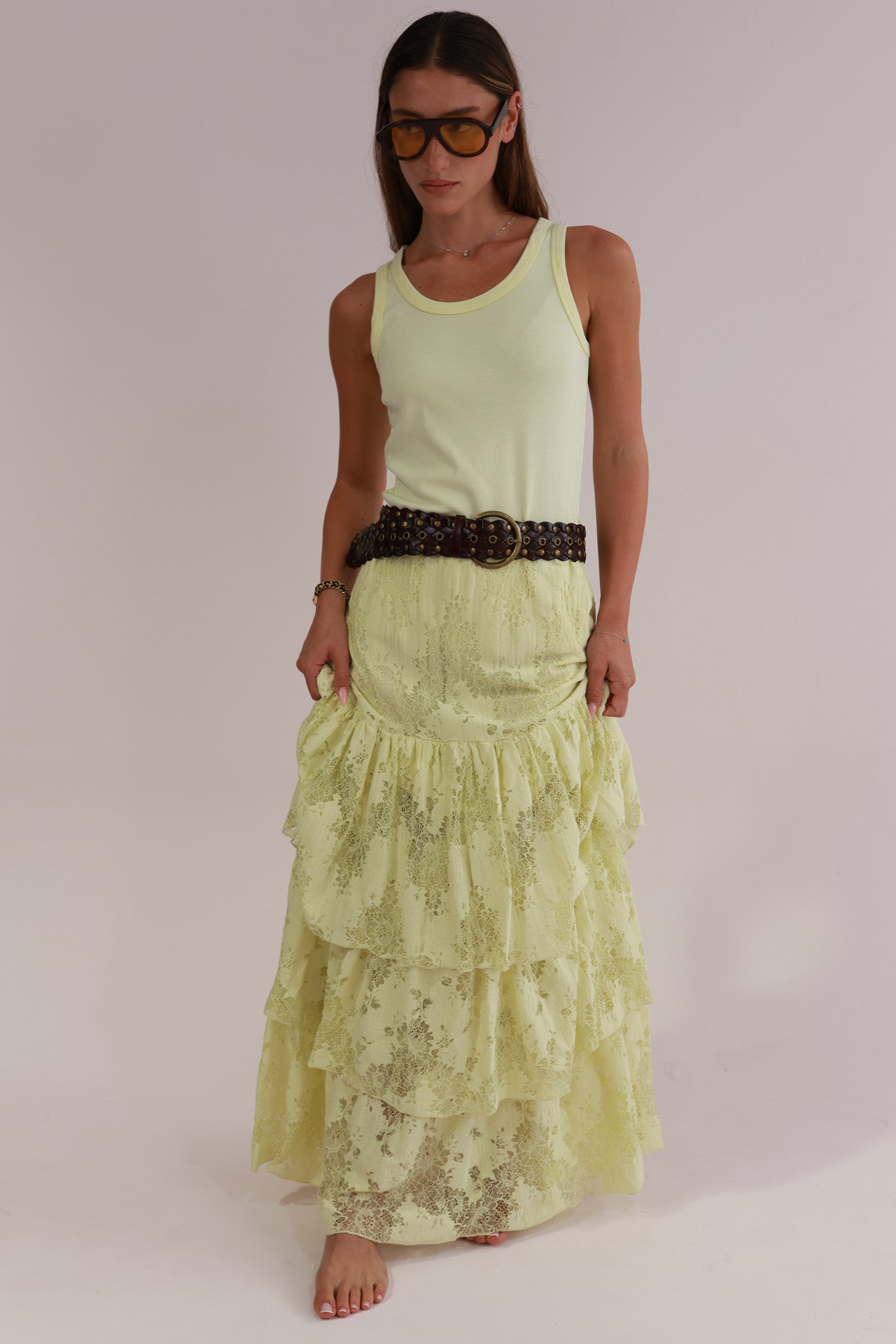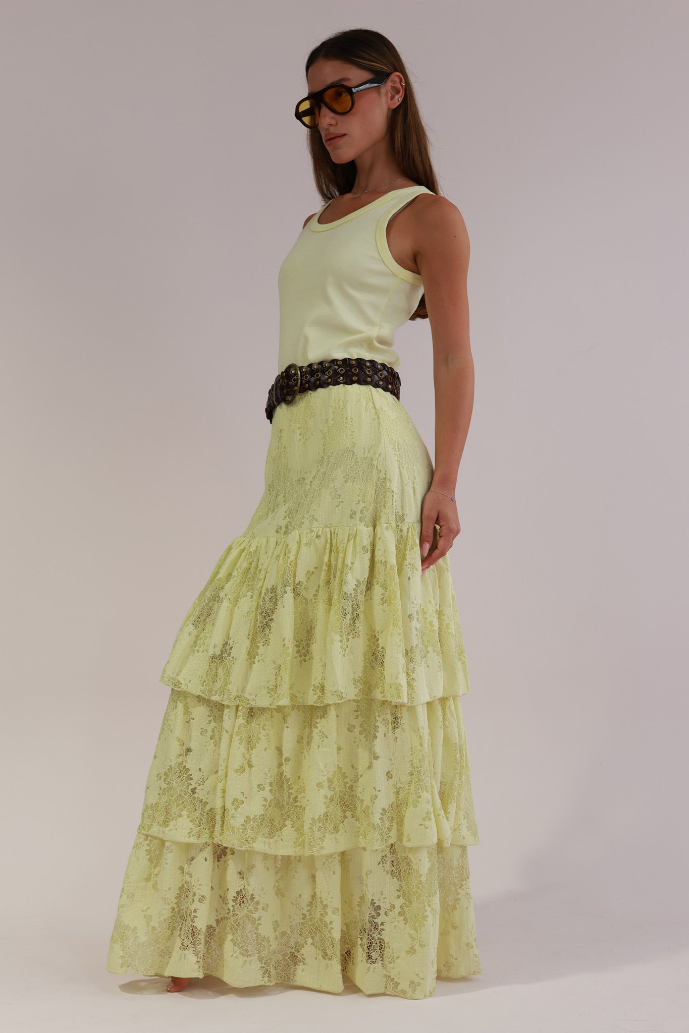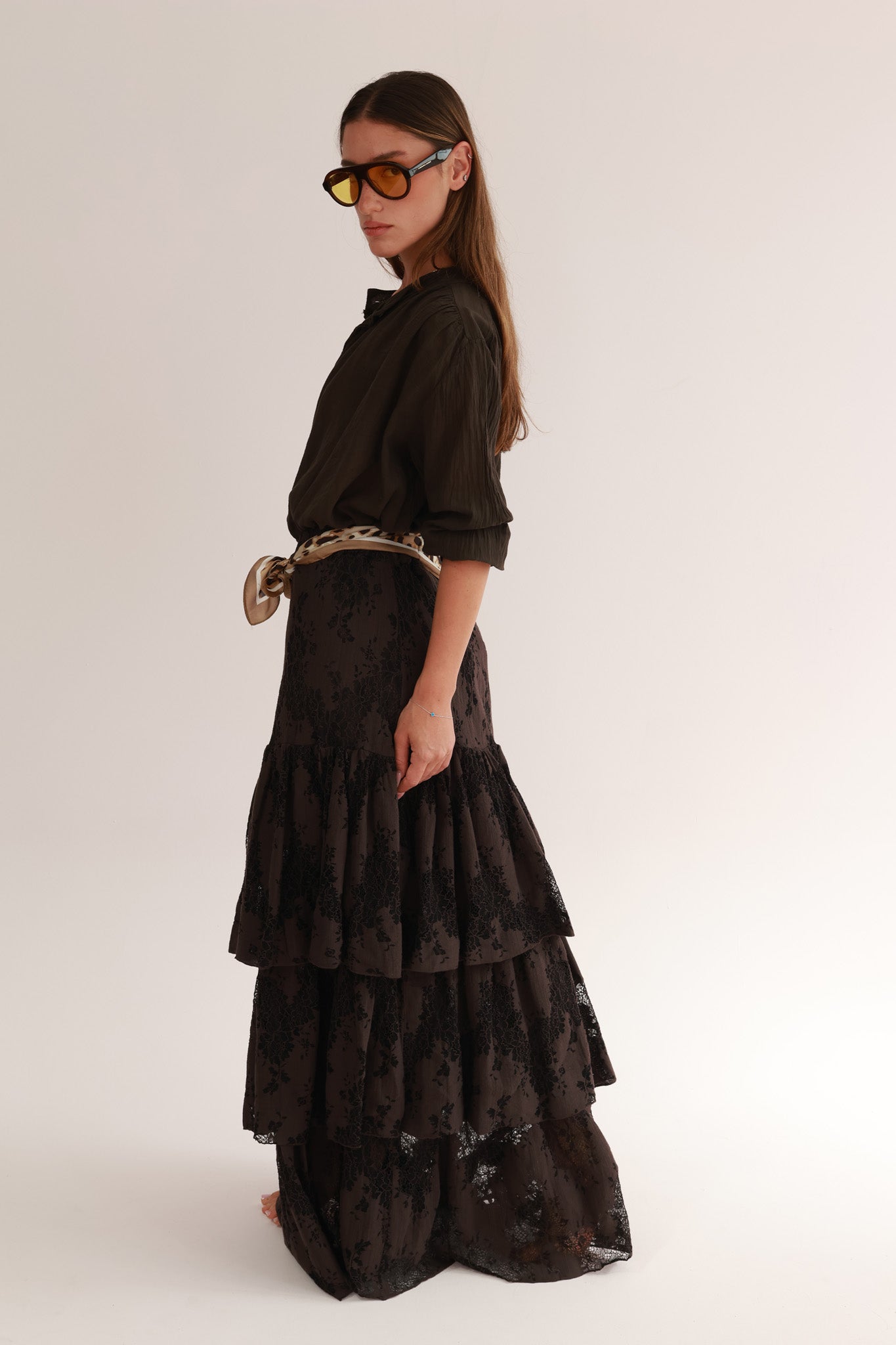 Romantic lace skirt featuring cascading ruffles for an elegant, feminine movement