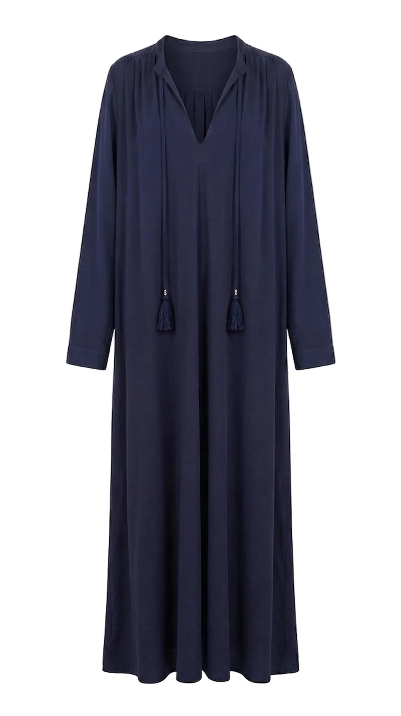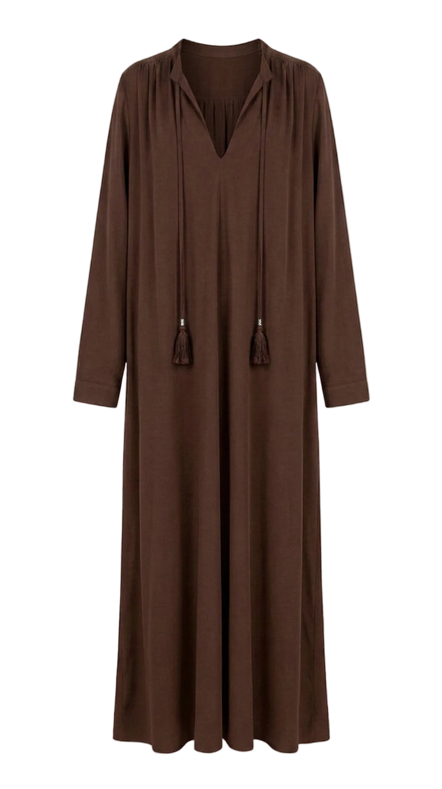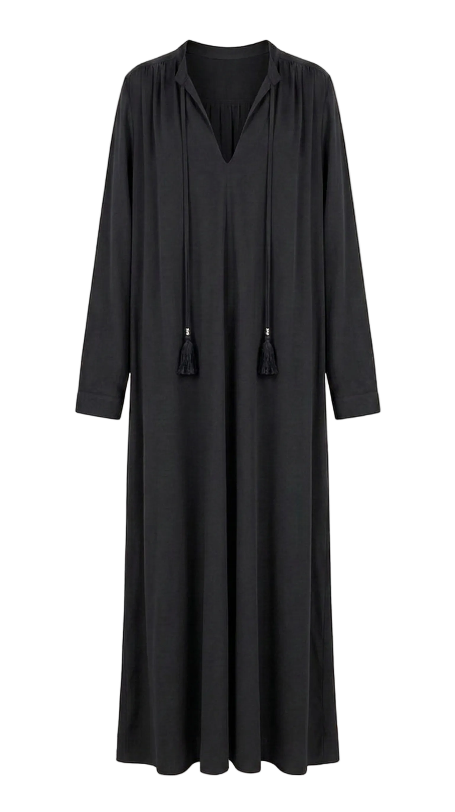 This elegant dress features a flattering V-neckline that enhances the silhouette with a delicate and feminine touch. The design is elevated with decorative pompom details, adding subtle texture and character while keeping the look refined and timeless.
