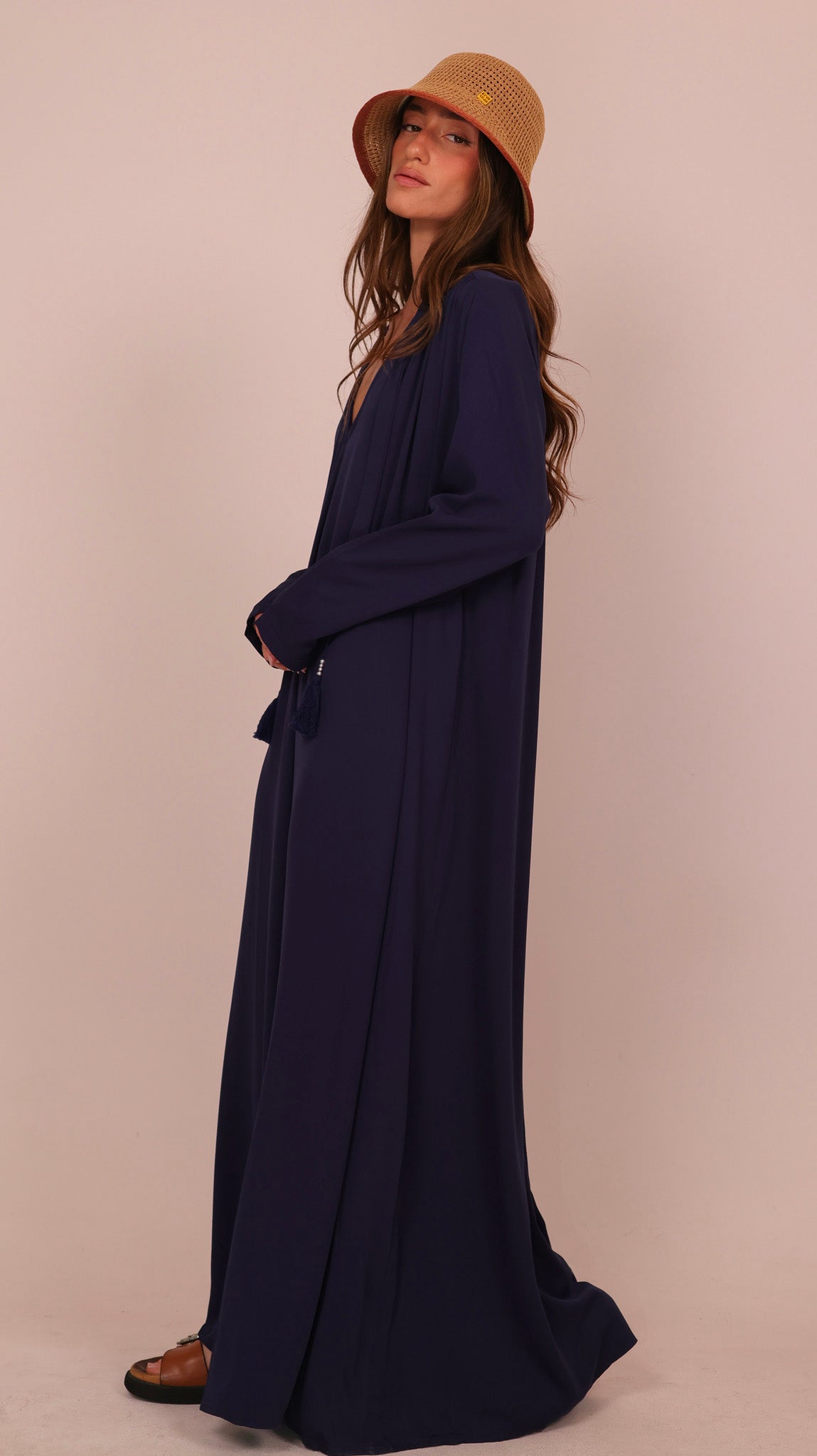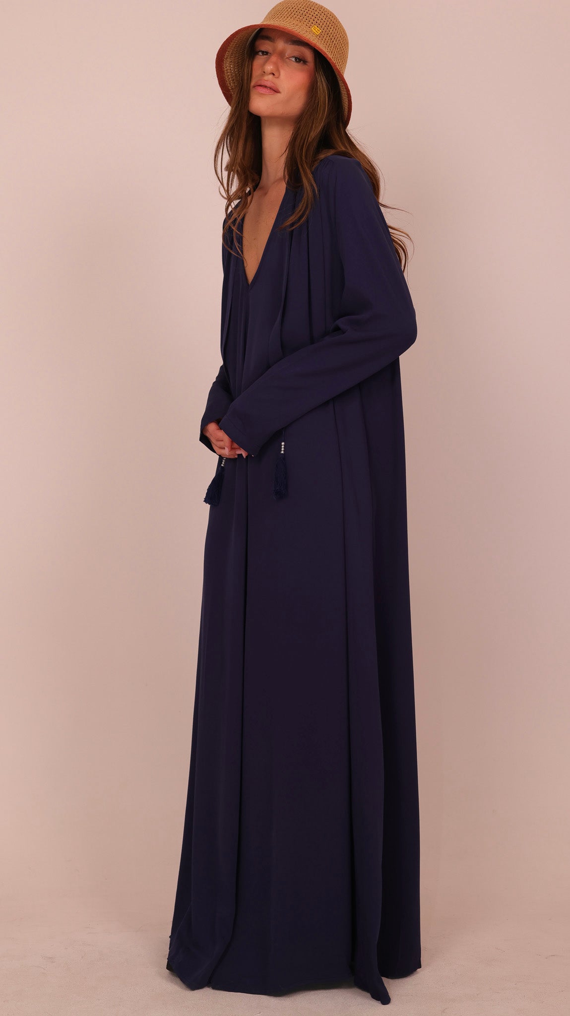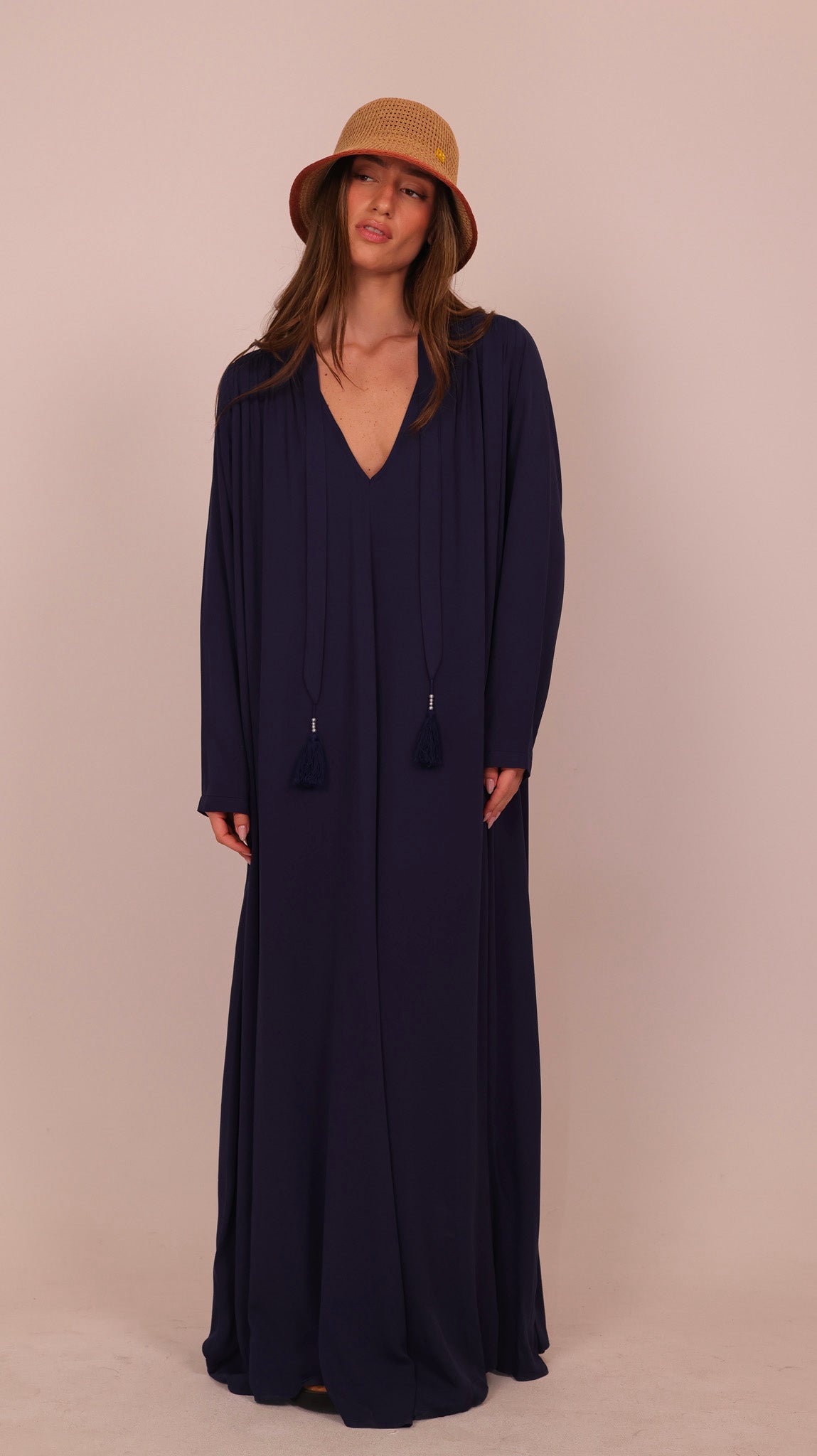 This elegant dress features a flattering V-neckline that enhances the silhouette with a delicate and feminine touch. The design is elevated with decorative pompom details, adding subtle texture and character while keeping the look refined and timeless.