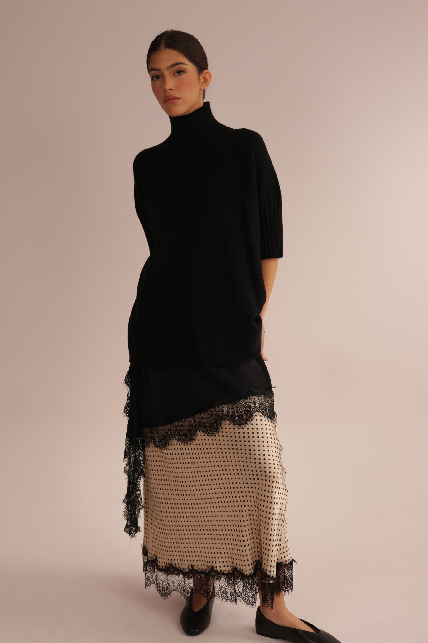 Elegant lace skirt featuring a refined small-dot pattern