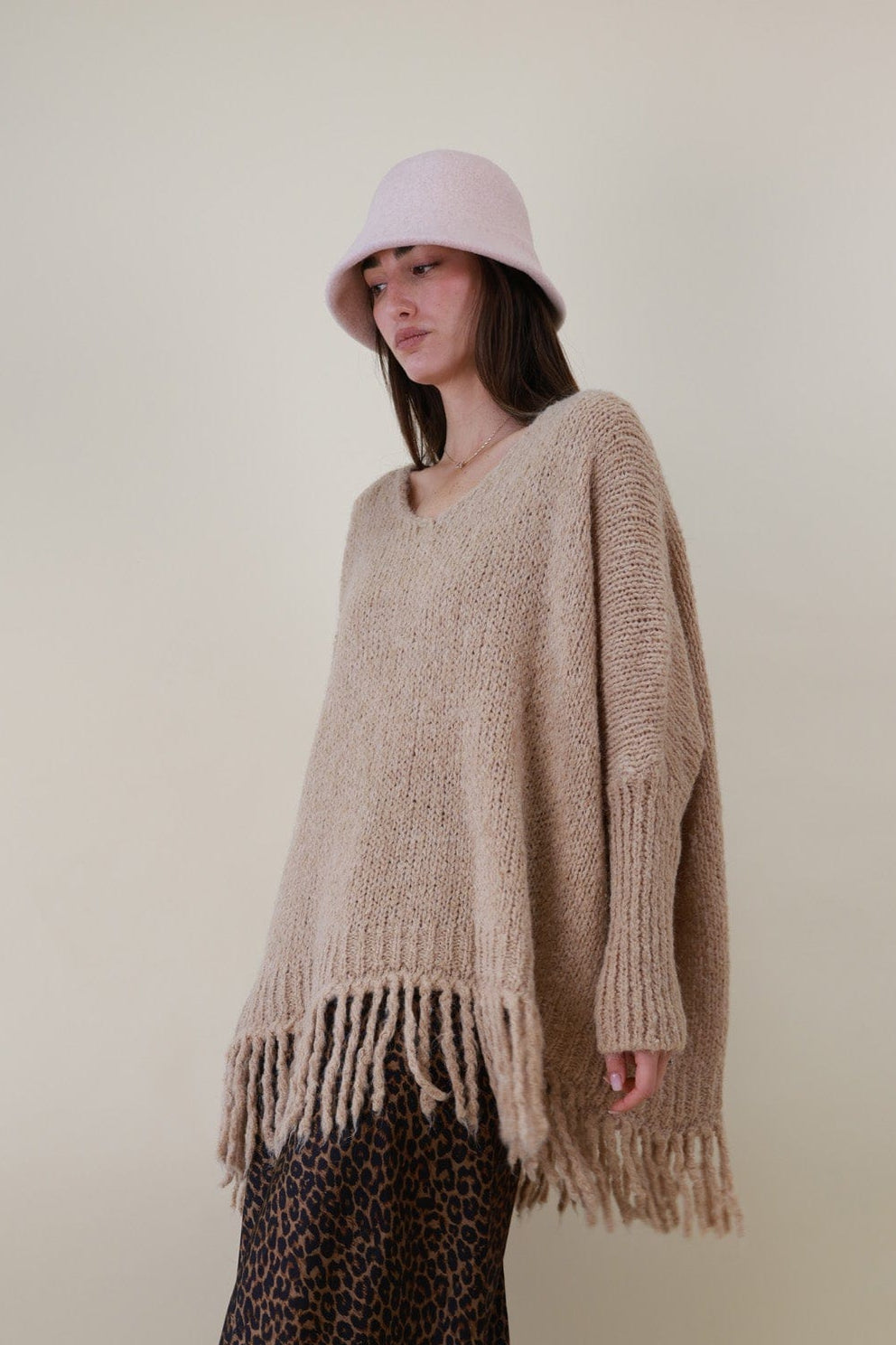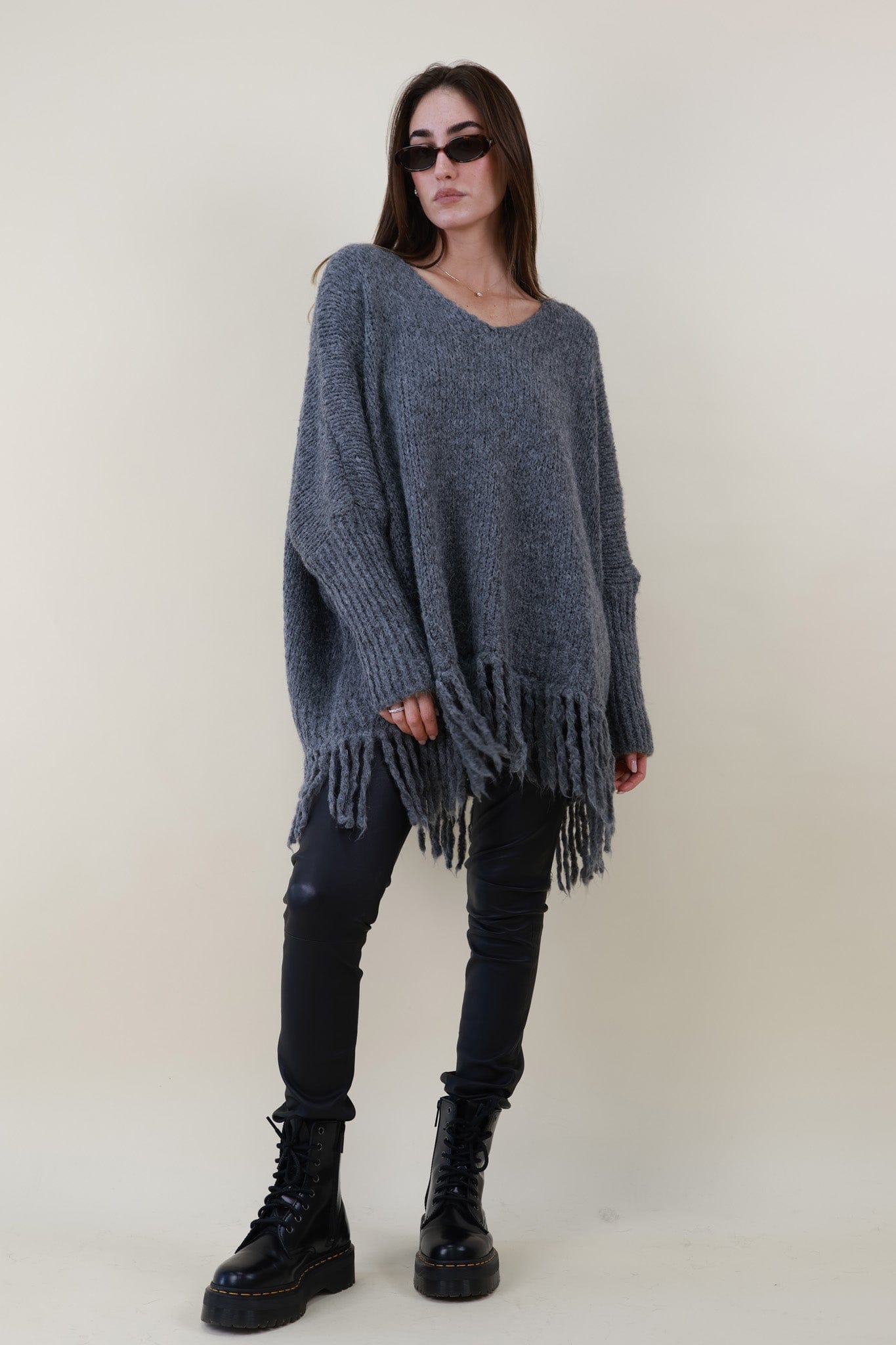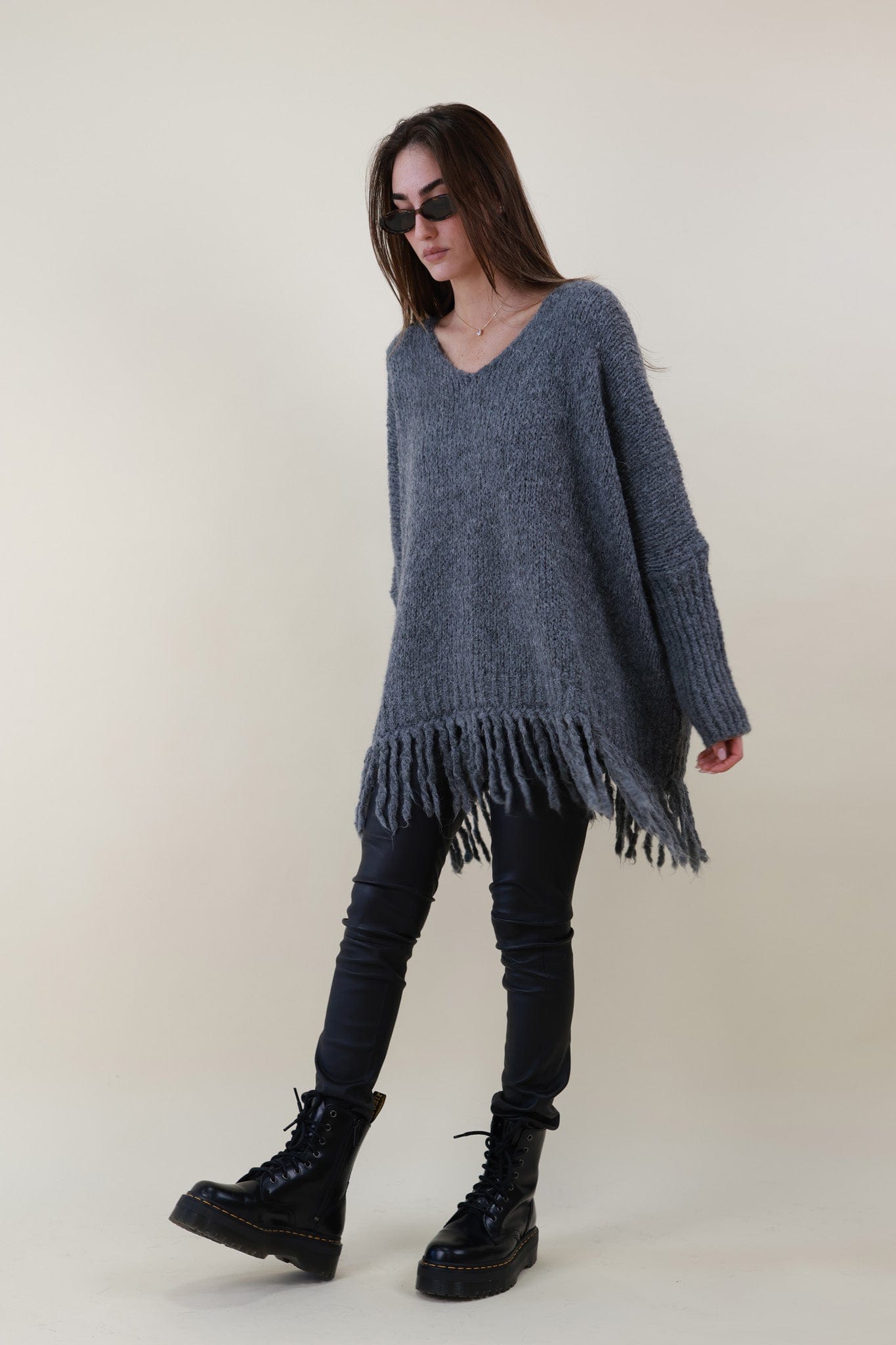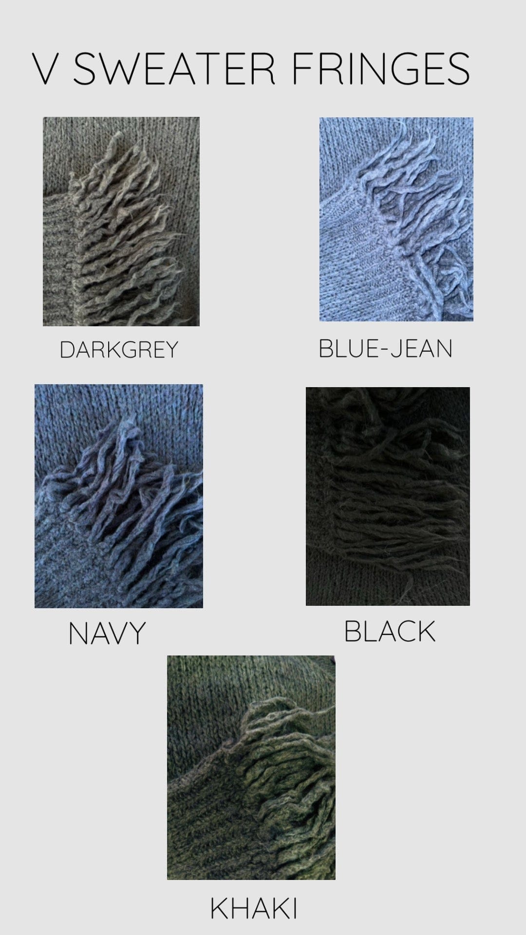 V SWEATER FRINGES – A chic V-neck sweater with stylish fringe details.
