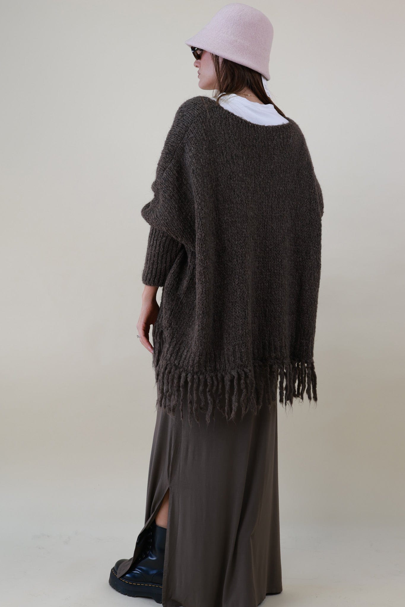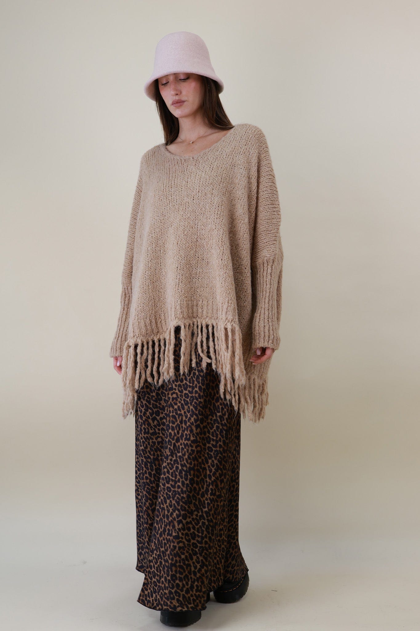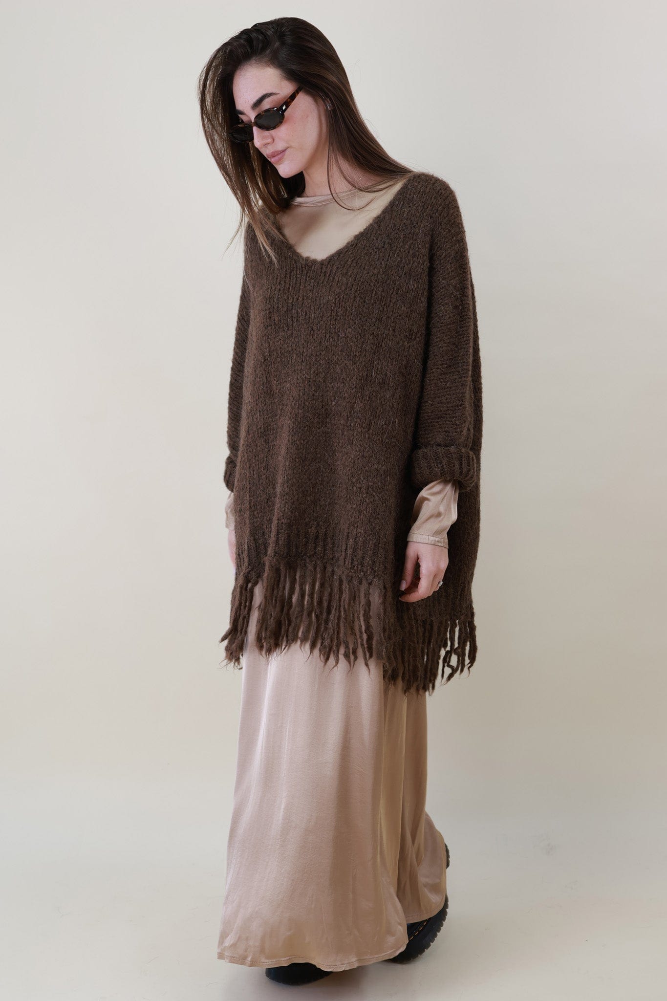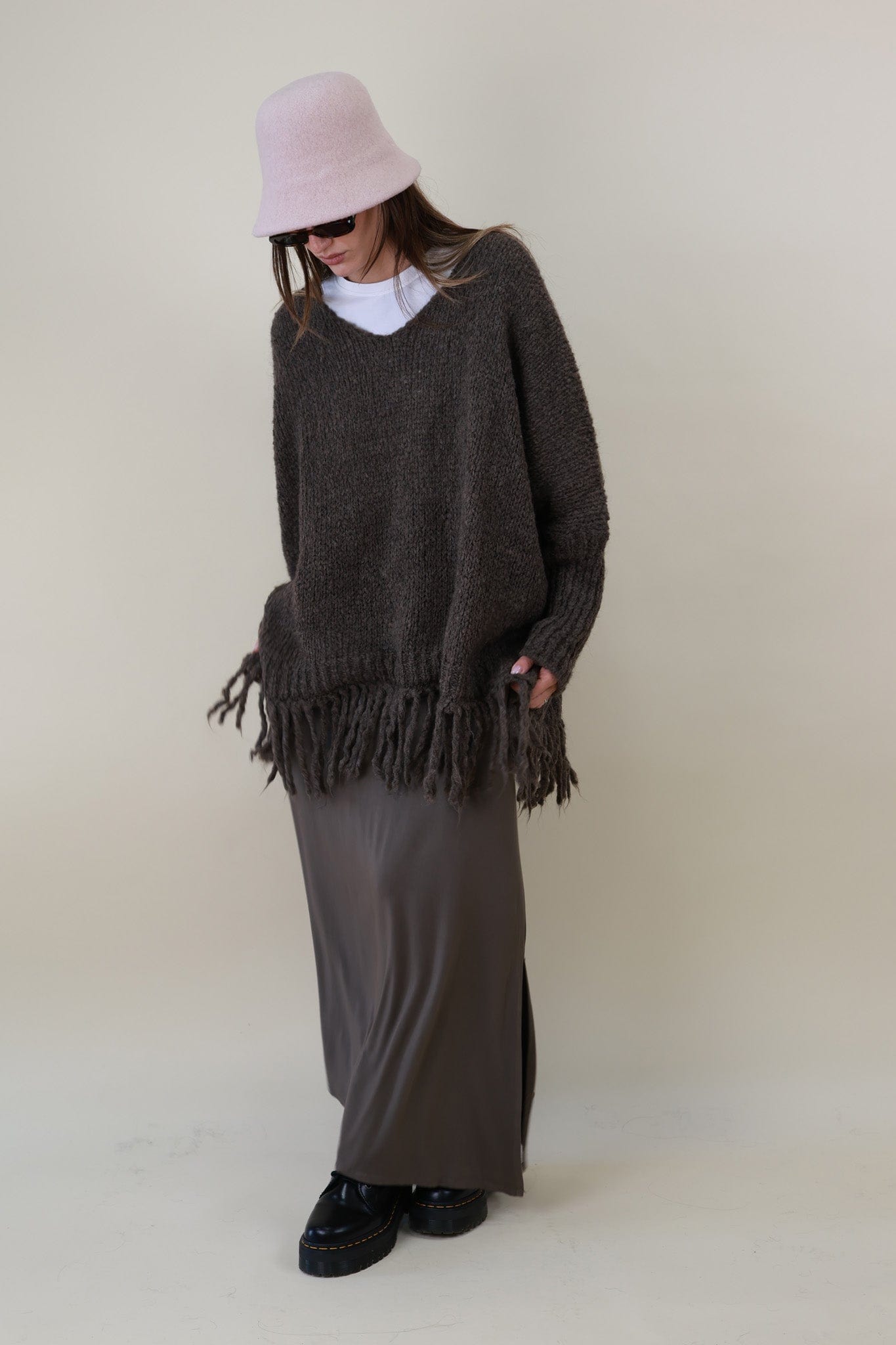 V SWEATER FRINGES – A chic V-neck sweater with stylish fringe details.