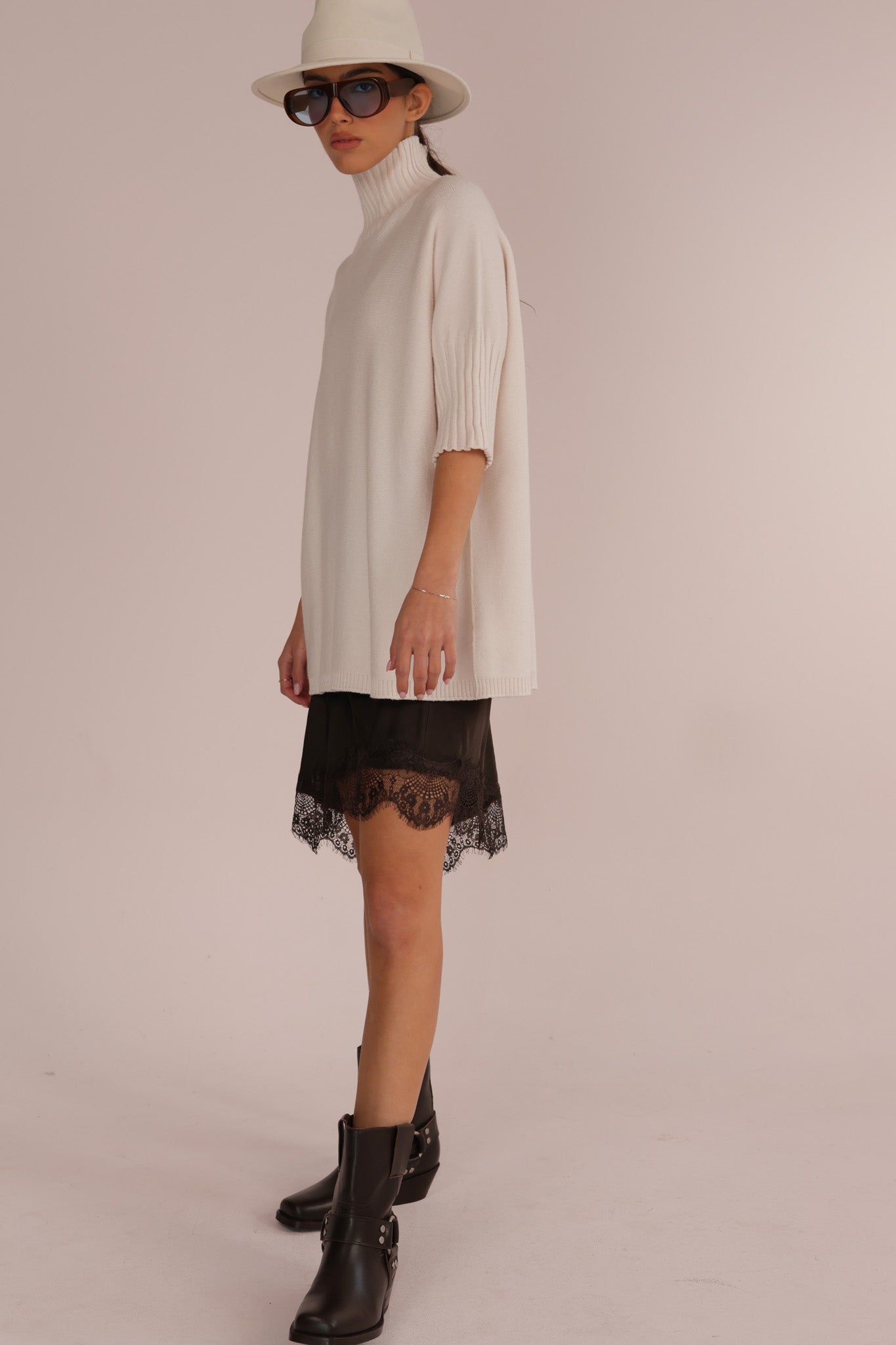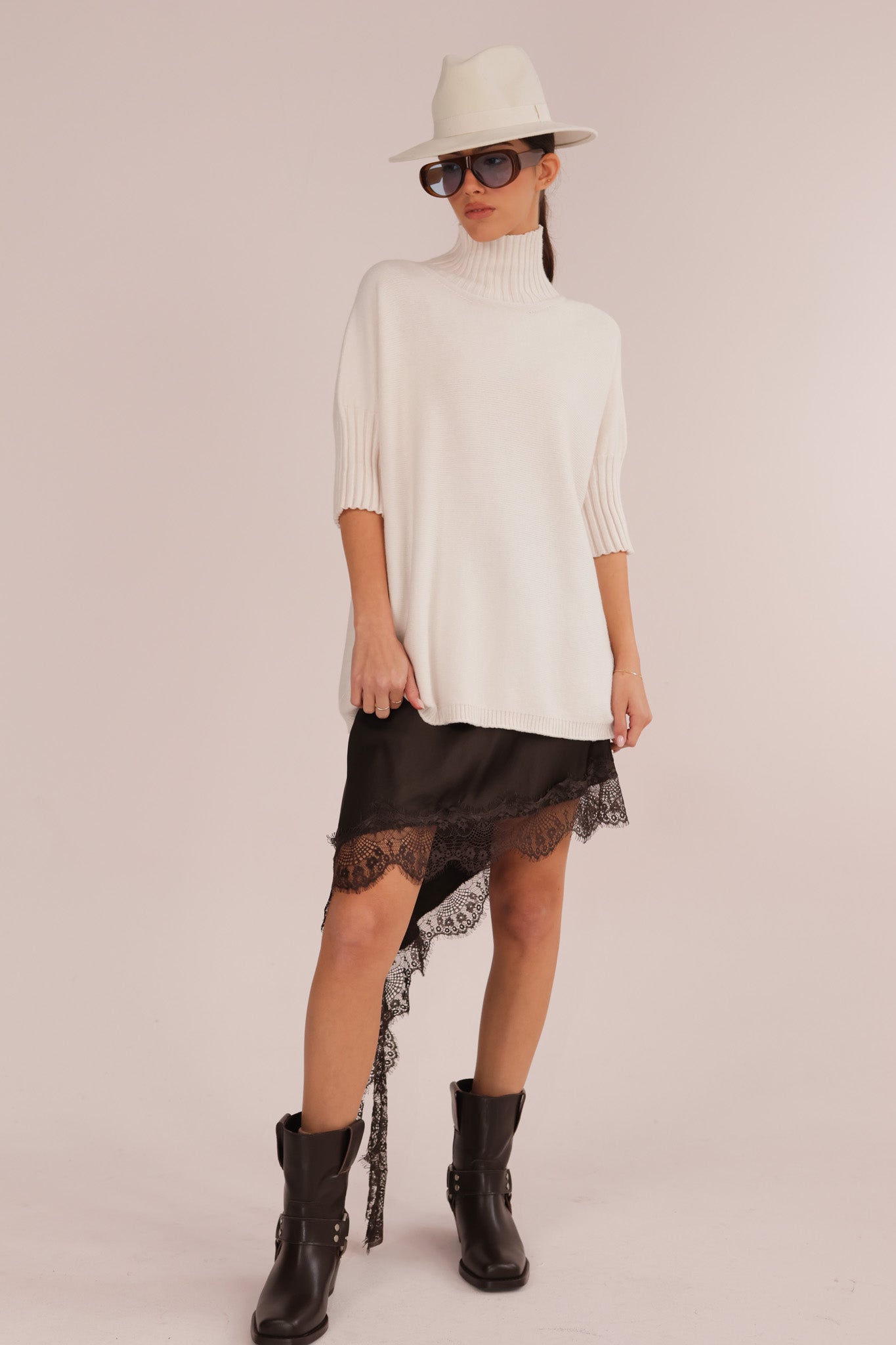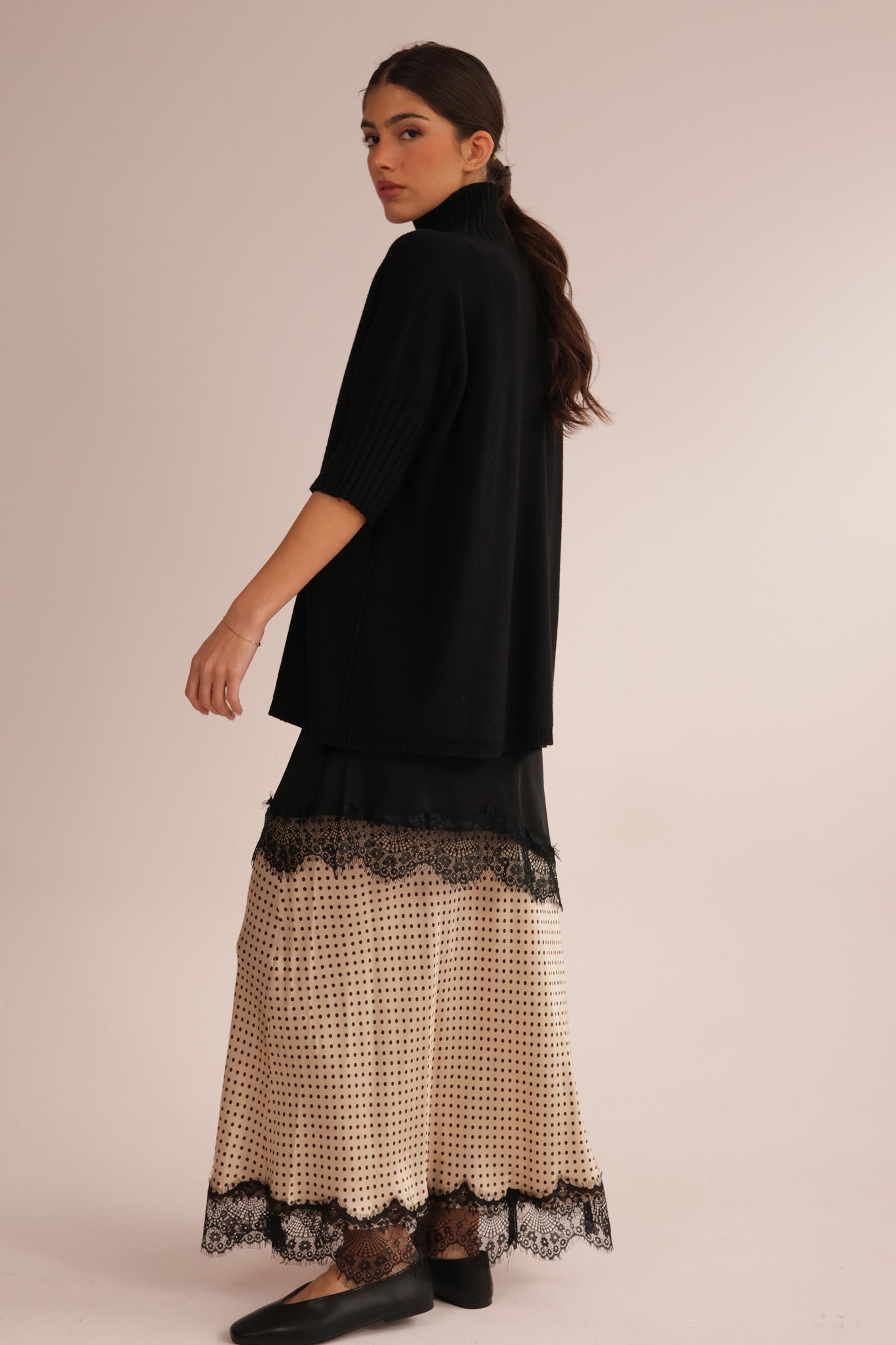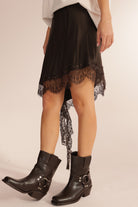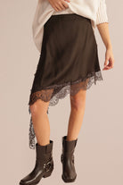 ASYMETRICAL SATIN LACE SKIRT – Asymmetrical satin skirt with lace details.