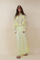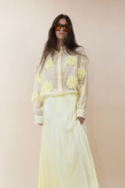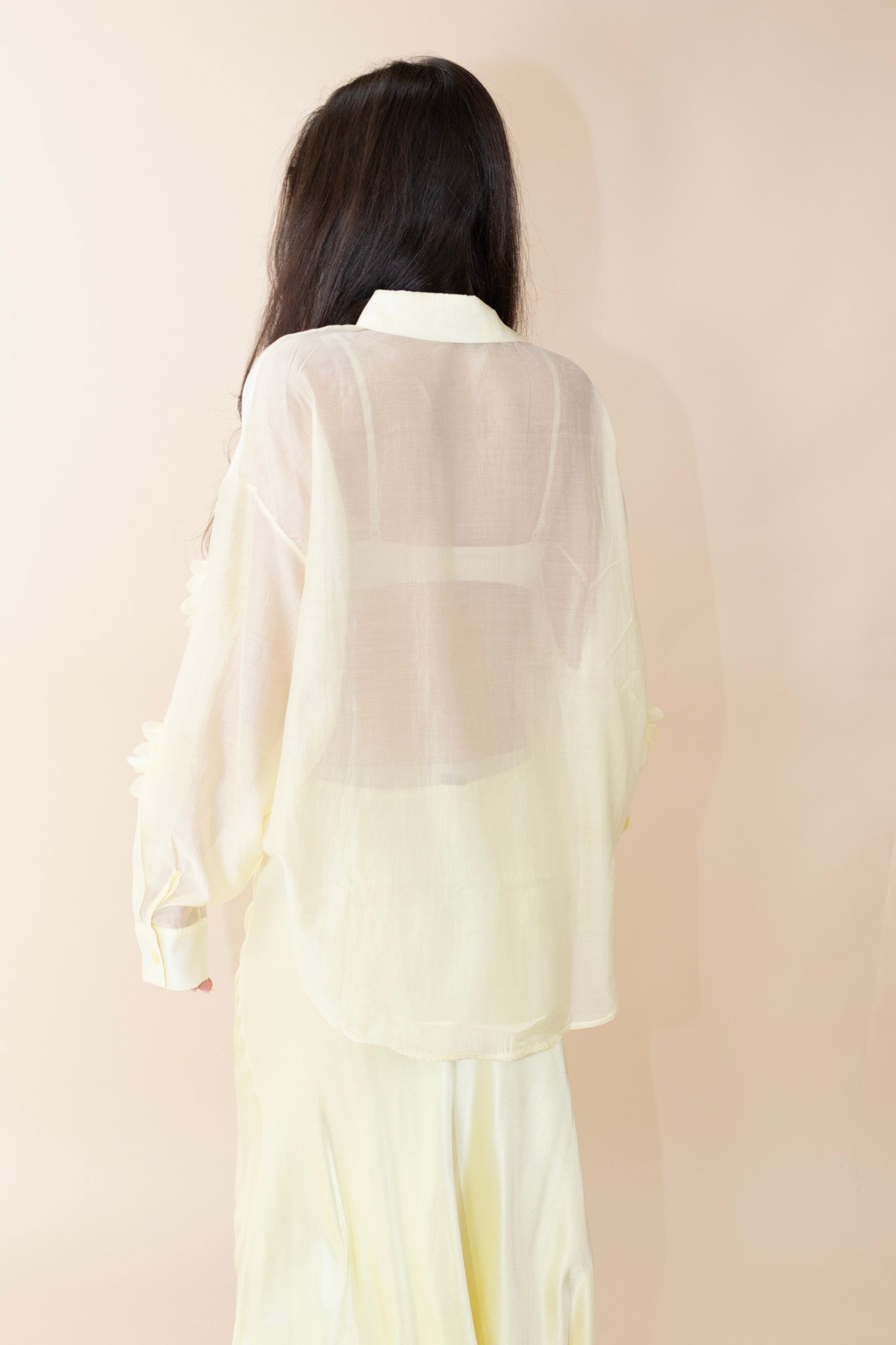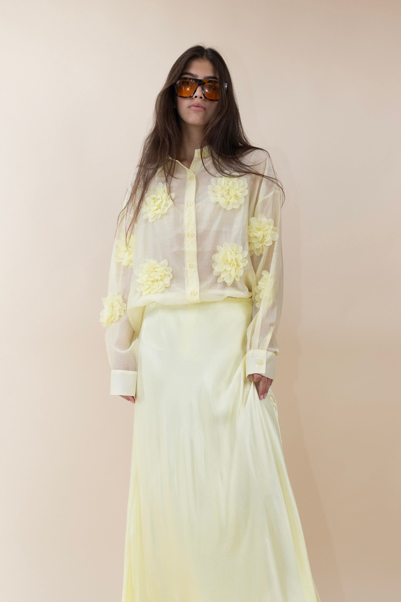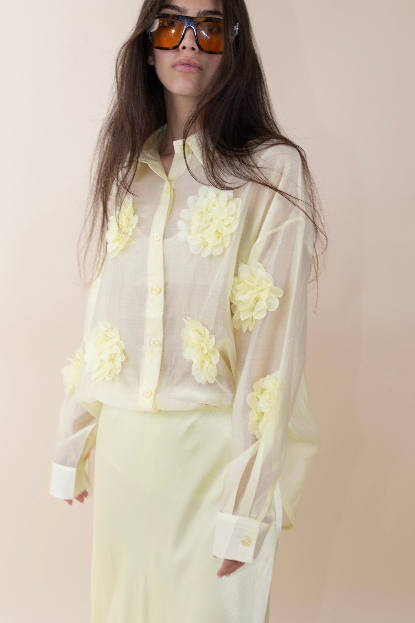 Flowy shirt with 3D floral embellishments for a feminine and delicate look. Its relaxed fit and subtle sheerness make it perfect for the season. Available in multiple colors to suit your style.