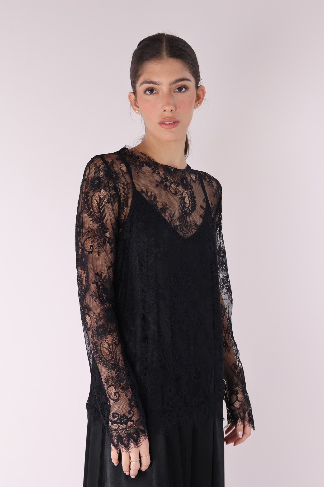LACE TRANSPARENT TOP– Elegant sheer lace top with delicate detailing.