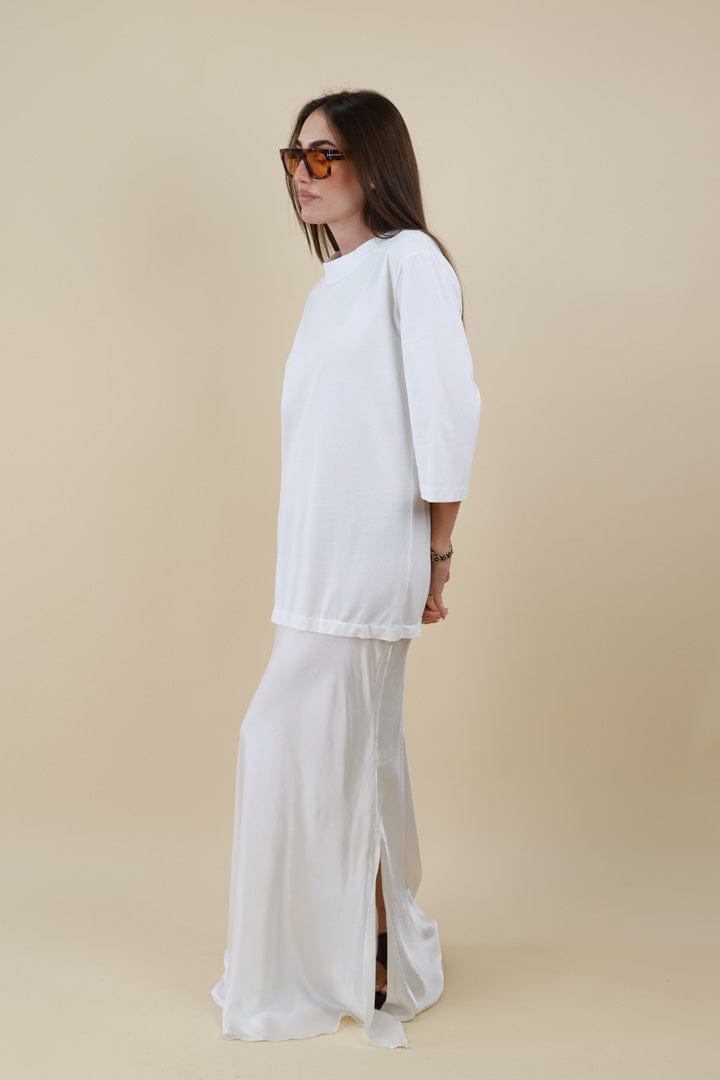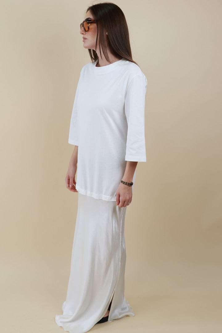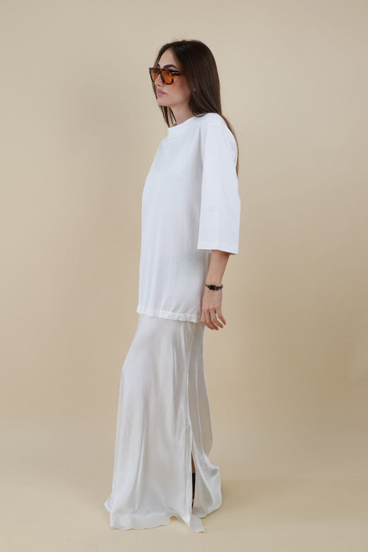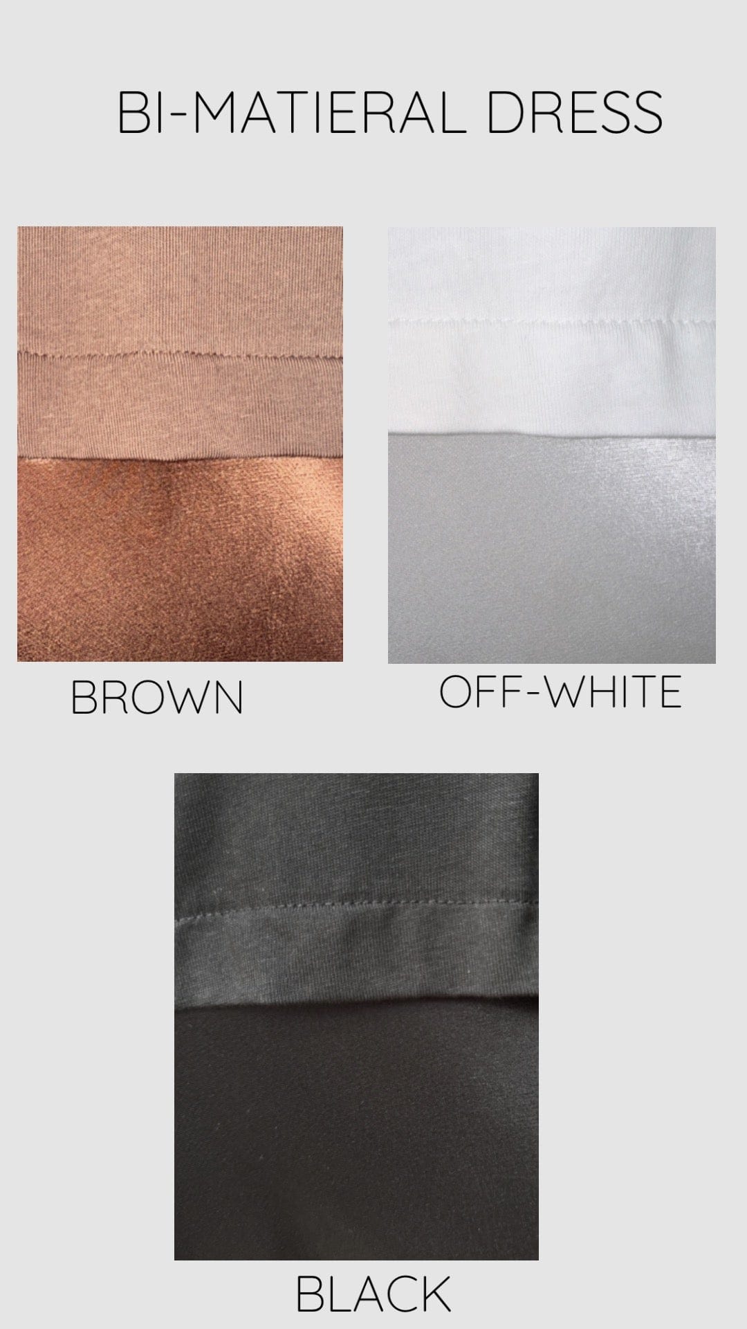 Bi-material dress featuring a soft viscose top and a satin-style bottom. A refined silhouette that blends comfort and subtle shine for a chic everyday look.