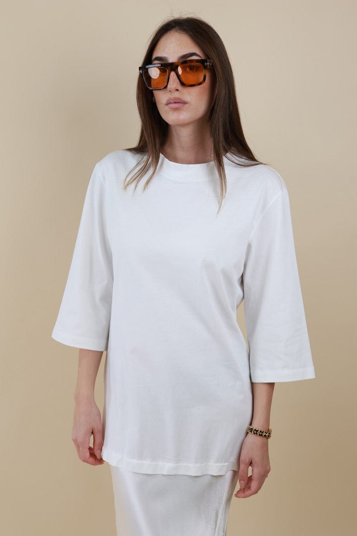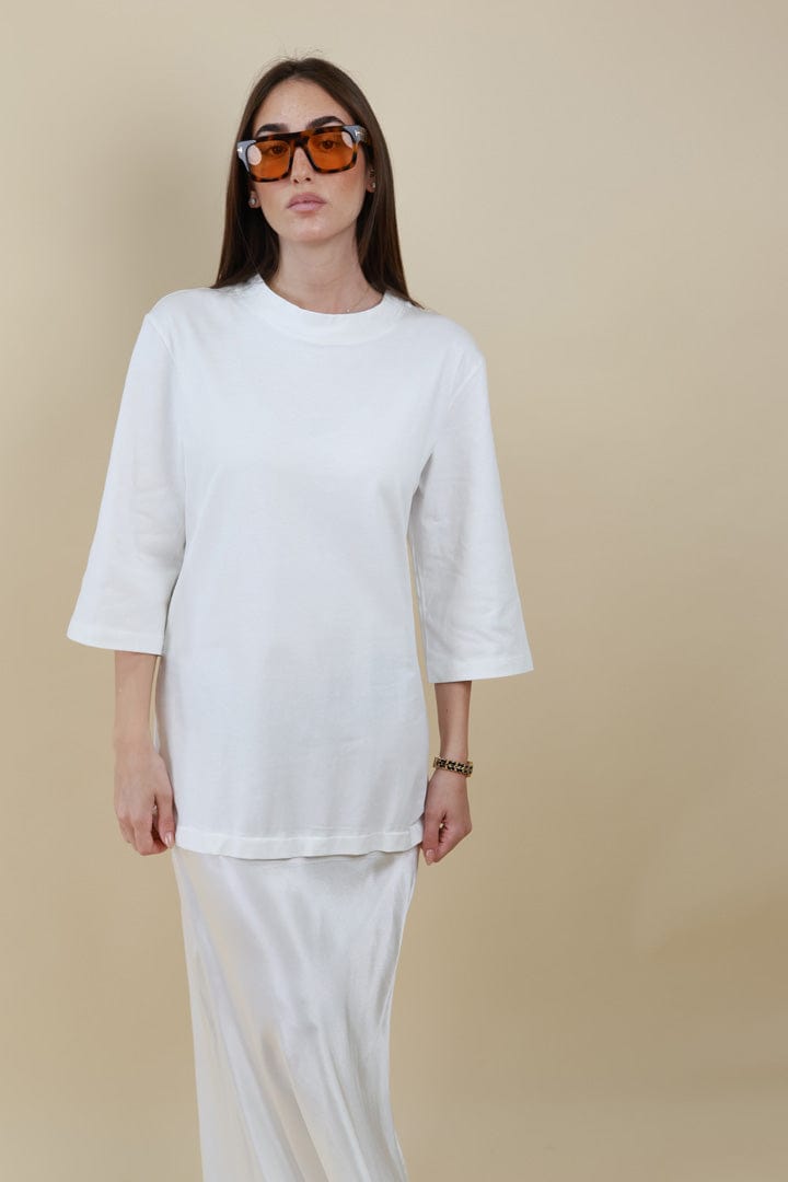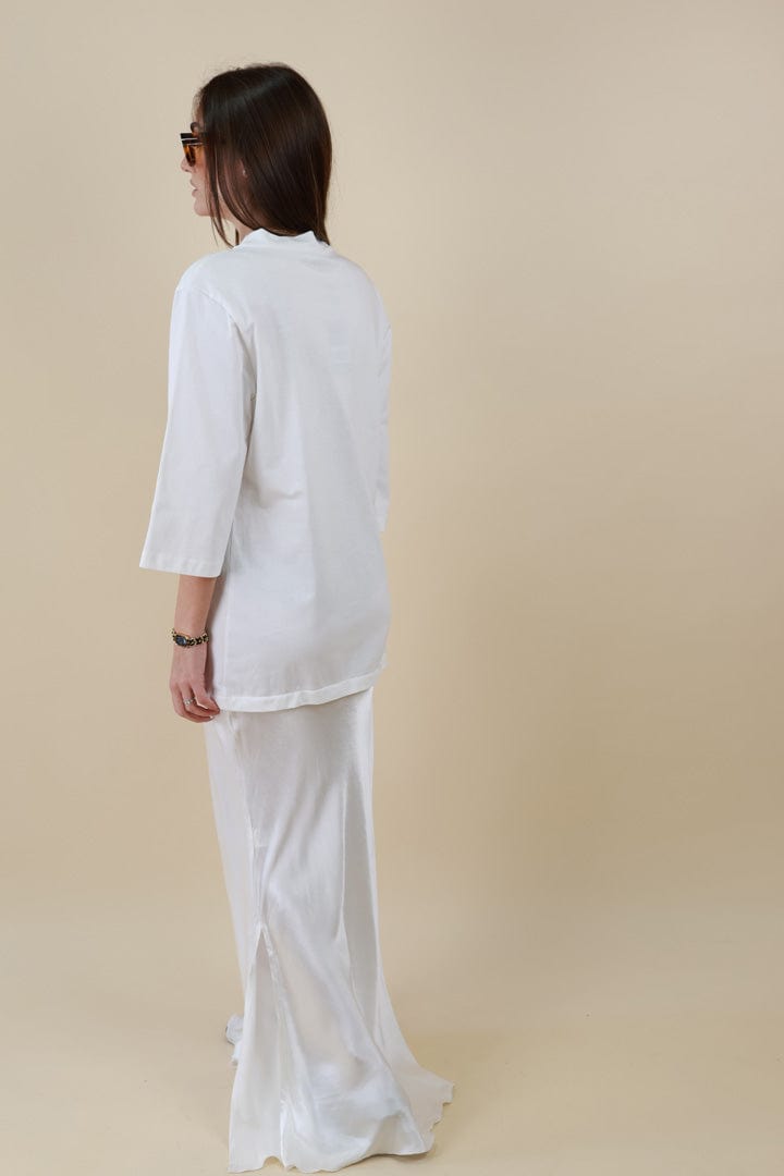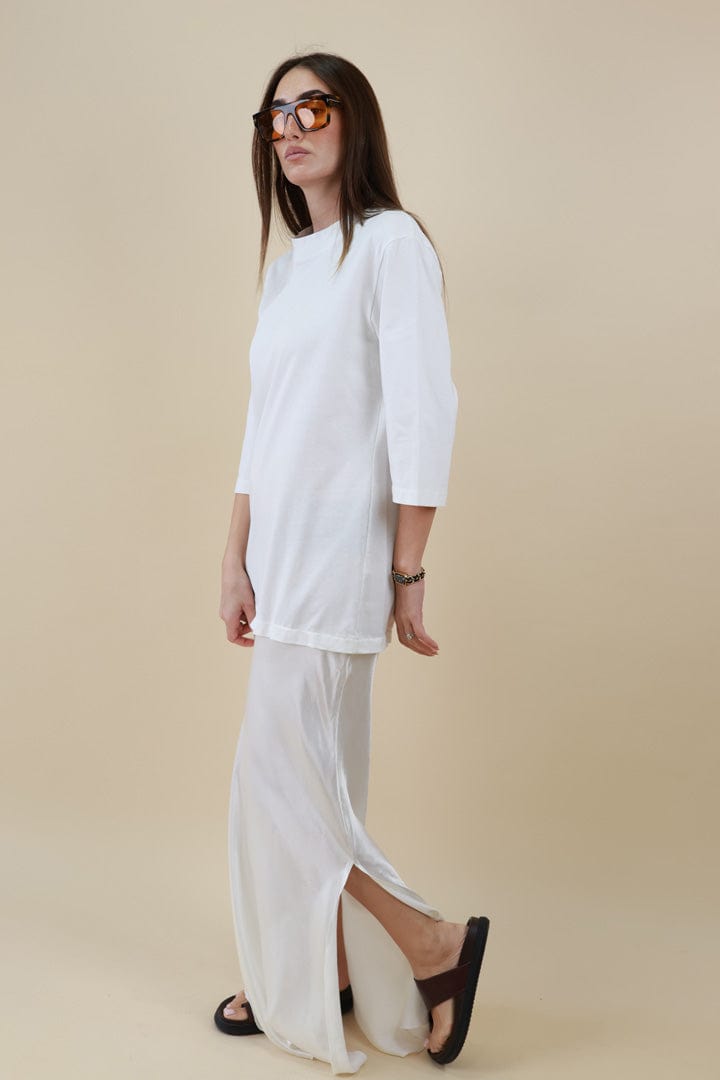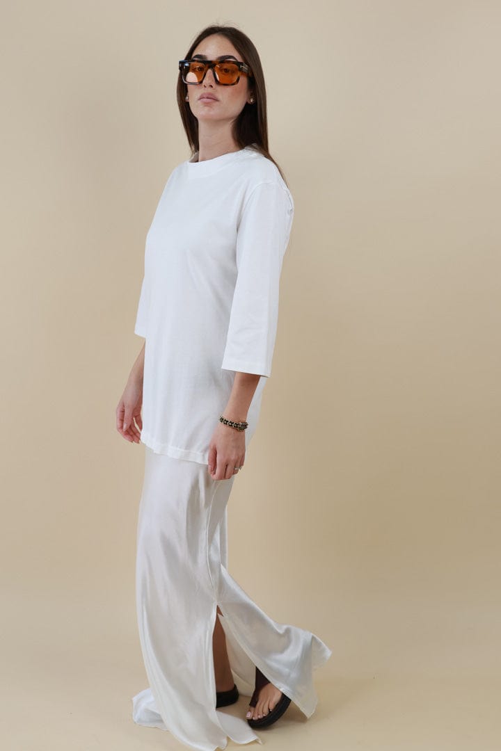 Bi-material dress featuring a soft viscose top and a satin-style bottom. A refined silhouette that blends comfort and subtle shine for a chic everyday look.
