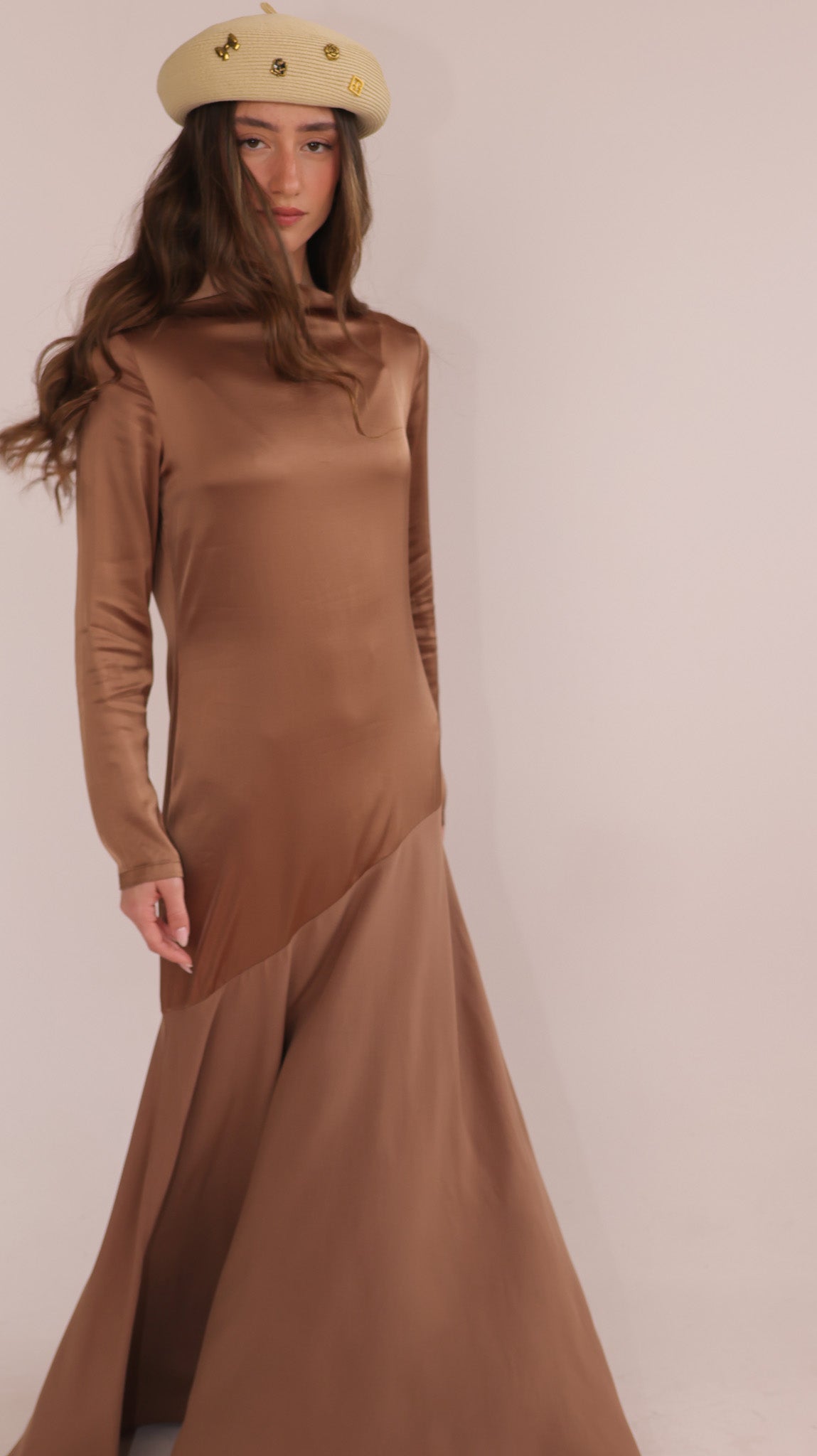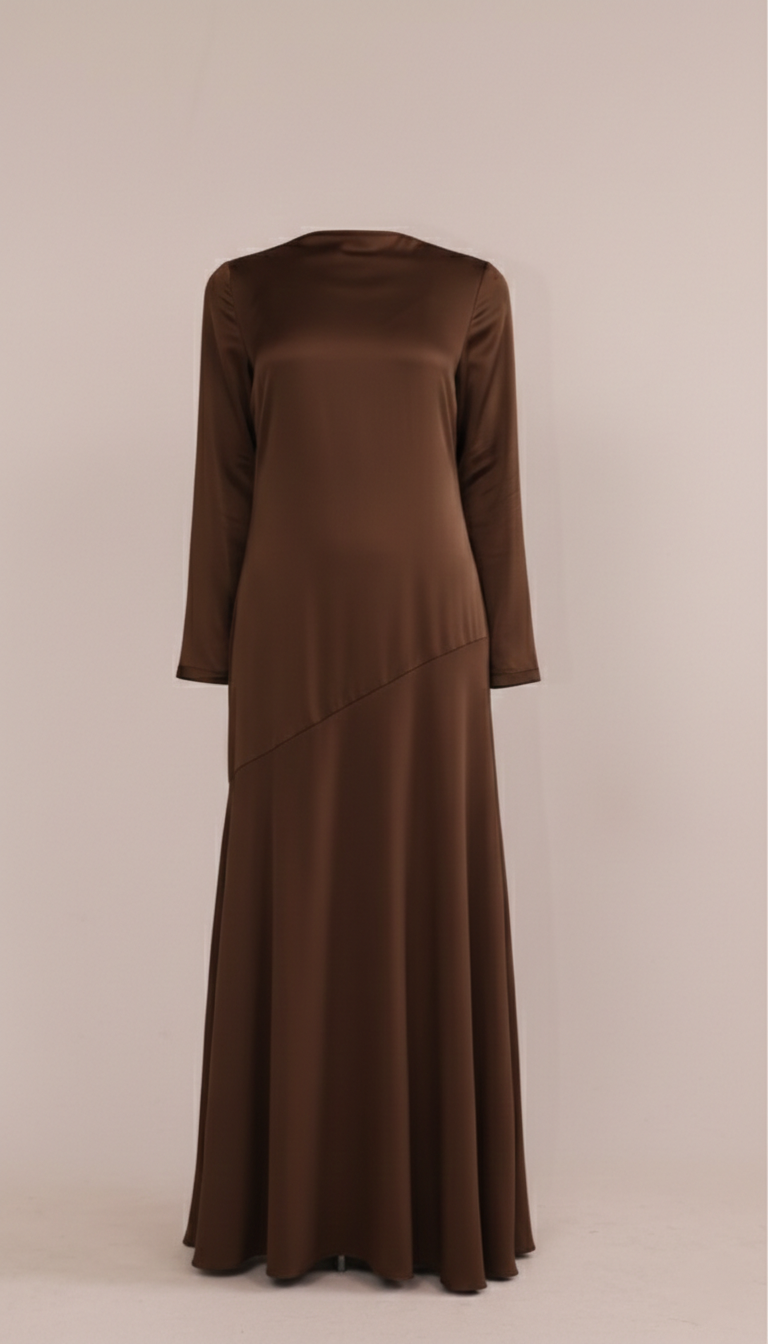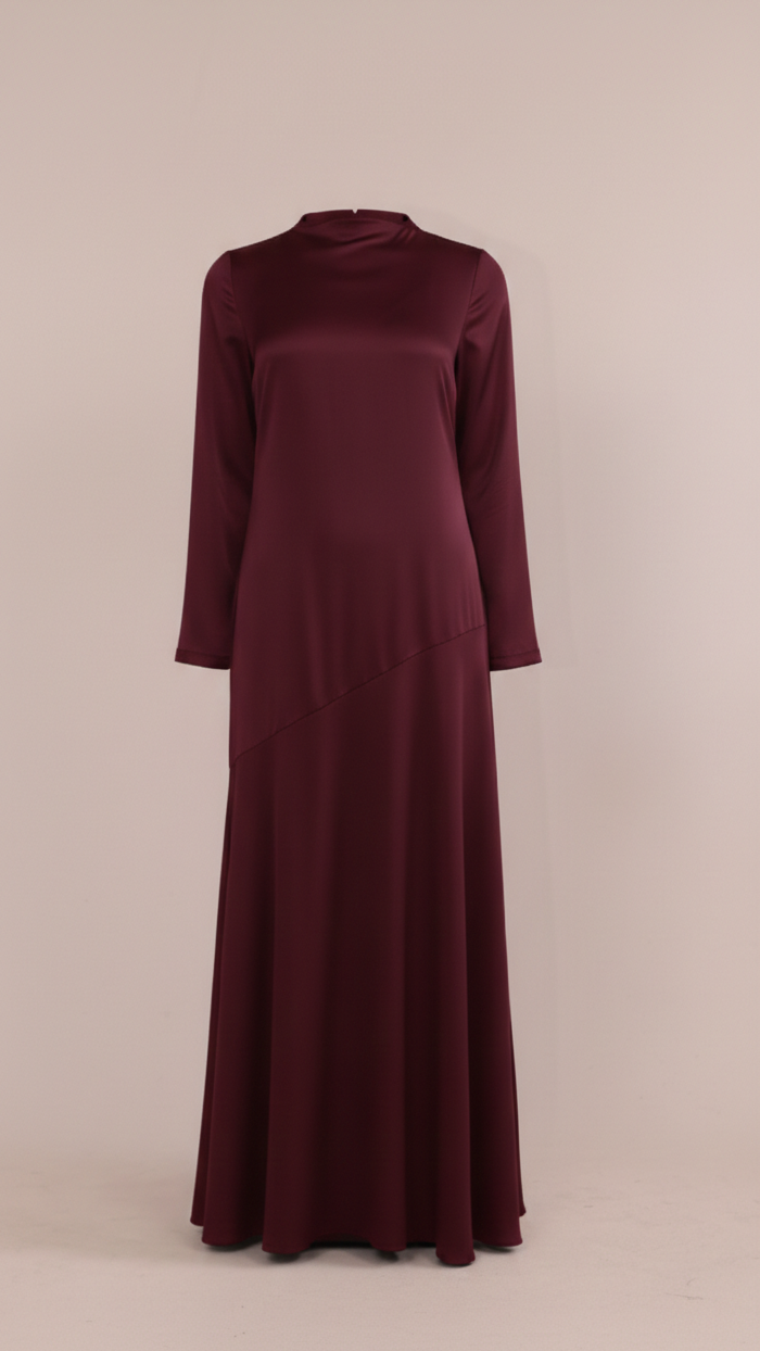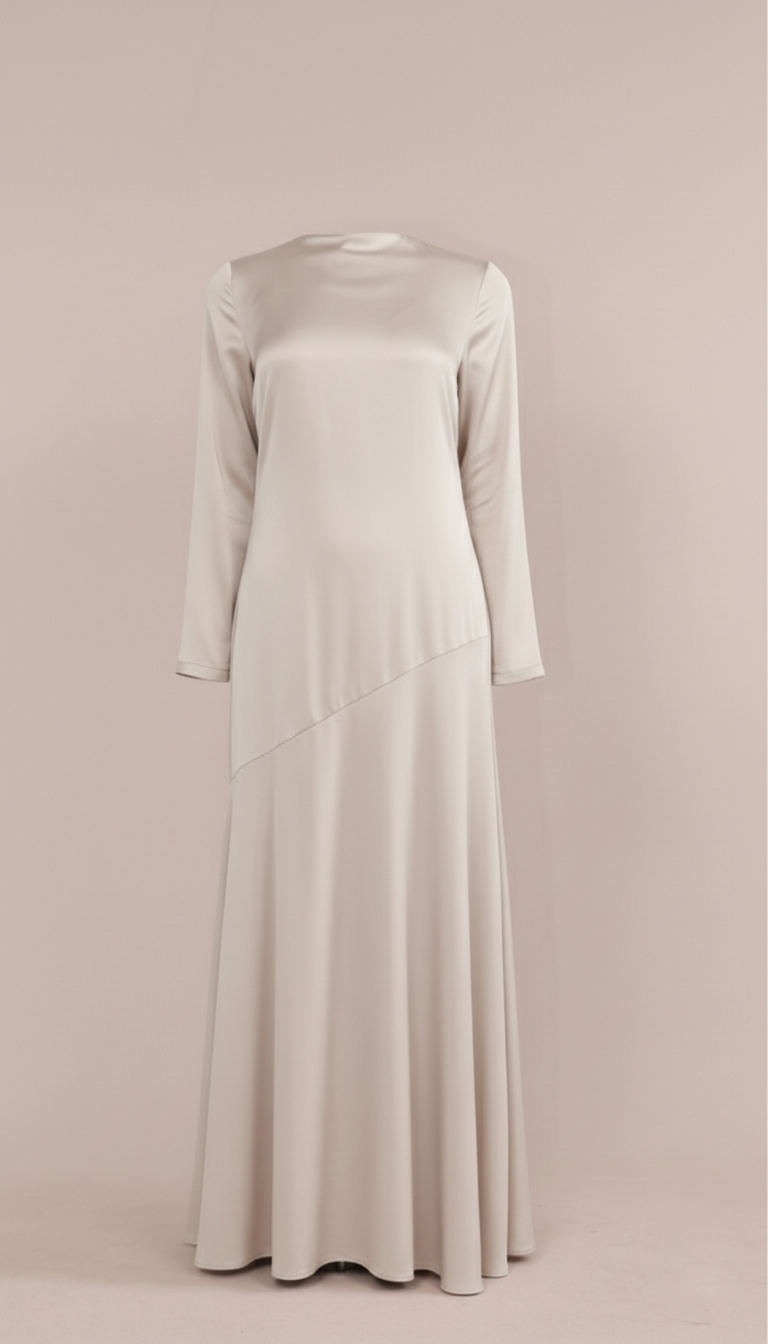 Crafted from a silky satin fabric, this bi-material dress drapes beautifully along the silhouette. Its straight cut creates a refined and modern line, while the soft sheen enhances every look with understated elegance. The contrast of textures adds subtle depth, giving the piece a contemporary edge.