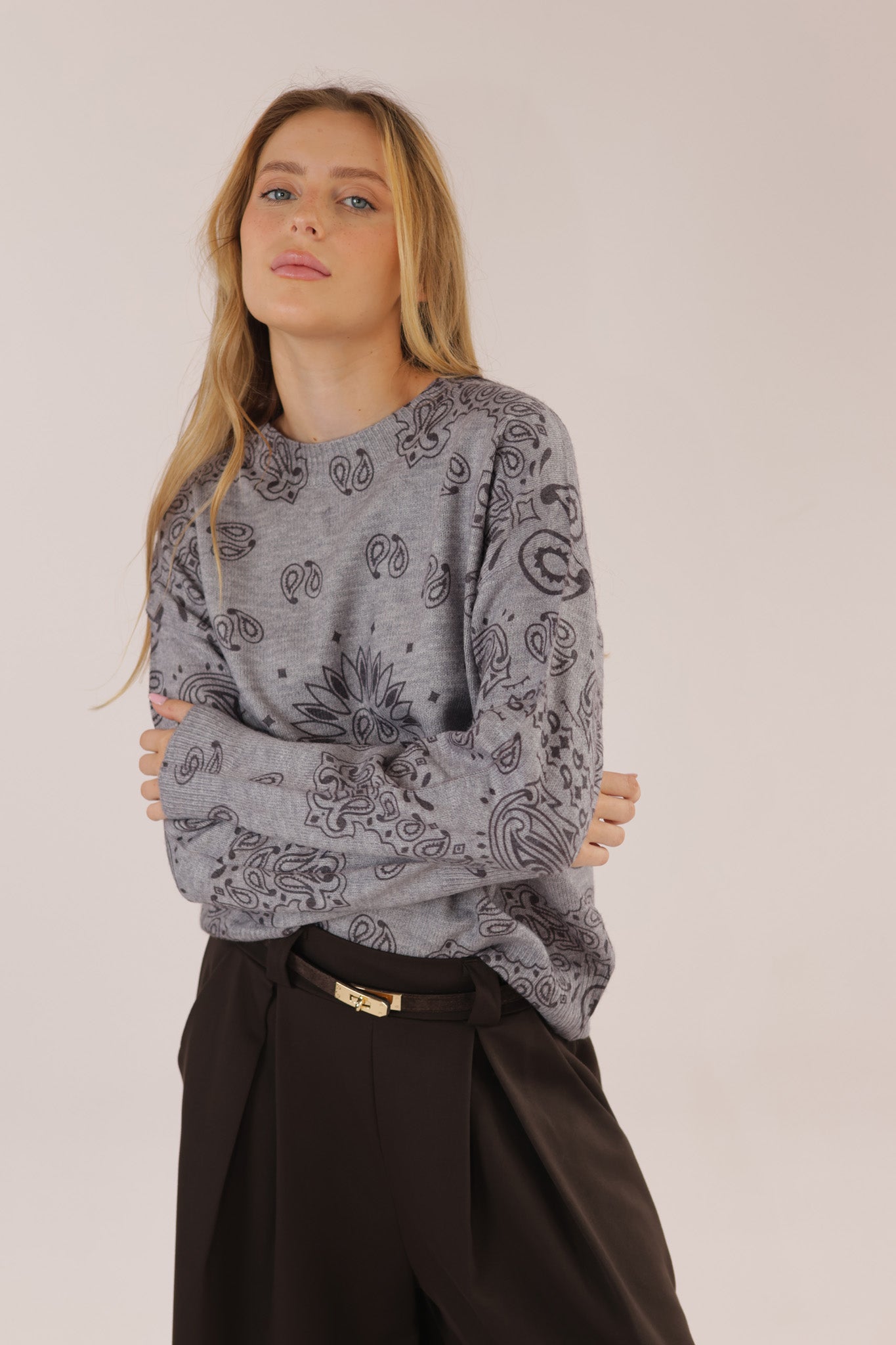 ROUND CASHMERE PRINT KNIT – Modern round-neck cashmere knit featuring a subtle print.